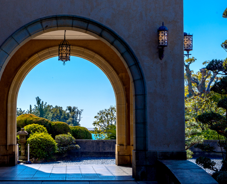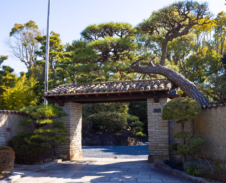 松の木に包まれた表門を入り、玉砂利を洗い出しで仕上げたアプローチを進むと、柔らかなアーチが特徴の玄関ポーチが出迎えてくれます。東西に長く配置された主屋には和室など、日本の文化を愛したジェームス氏の想いが随所に伝わる建築です。