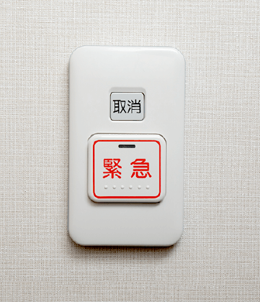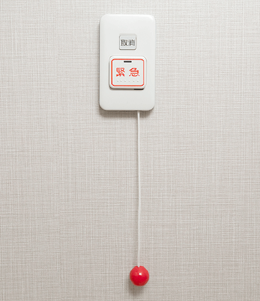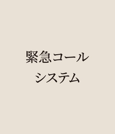 住戸内で急に体調が悪くなった場合も安心。館内の生活支援スタッフ直通の緊急コールシステムをしっかり整えています。リビング・ダイニング、浴室、トイレに「押しボタン型」が各1個、室内どこでも利用できる「ワイヤレス型」を1個(有償で追加可能)。それぞれスイッチを押せば、24時間常駐の生活支援スタッフが迅速に対応します。